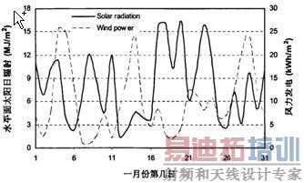 太阳能与风能在时间上有很强的互补性(如右图),白天阳光最强时,风很小,晚间没有阳光却有很强的风,利用这两种可再生资源的互补性,会使发电系统在资源上具有最佳的匹配性。风光互补并网发电系统在缓解电网压力、电力调峰、节能减排等方面都能够起到重要的作用。