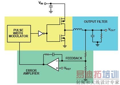 将典型开关电源输出电压(图1)与内部基准电压进行比较,可看到差别集中在脉宽调制器(PWM)。PWM将斜坡与放大器输出进行比较,生成PWM信号来控制开关,从而向负载供电。