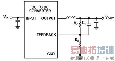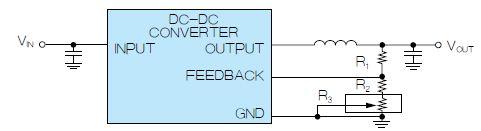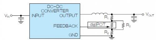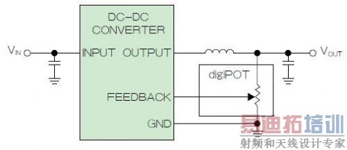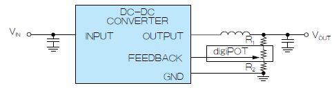 图2.使用数字电位计调整DC-DC转换器输出电压,组成可变反馈电阻