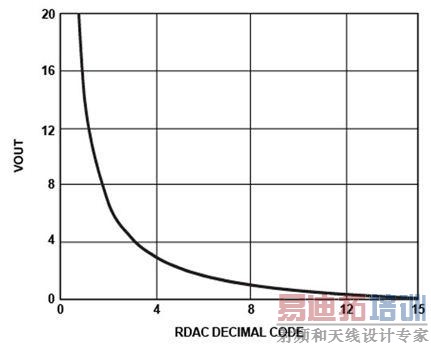 以RAW和RWB代替R1和R2可实现对数传递函数。数字码和输出电压之间的非线性关系降低了低端分辨率。图5显示了这个取自数字电位计的对数传递函数。