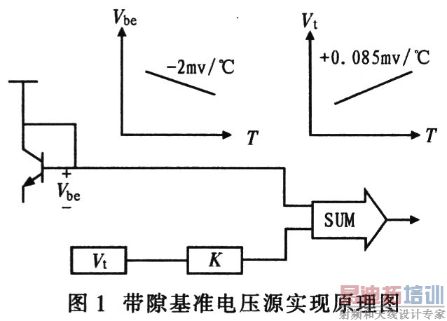 带隙基准电源的原理是将两个具有相反温度系数(TCs)的量以适当的权重相加,其结果显示为零温度系数。例如:对于随温度向相反方向变化的电压V1和V2,选取α1和α2,使得αaV1/aT+α2aV2/aT=0。这样可得到具有零温度系数的电压基准:Vref=α1V1+α2V2。