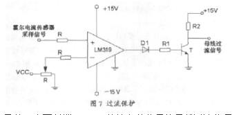 另外一个可封锁EXB841的输入的信号为母线过流信号,如图7.当逆变器输出端负载短路、逆变驱动电路工作不正常或换流失败时,均会引起短路过流。通过霍尔电流传感器监视逆变器输入的直流母线的电流,转换成电压信号,送入高速比较器与基准电压相比较,当超过基准电压时,表示有母线有过流情况发生,过流保护动作。比较器输出高电平,三极管导通,则输出为低,实现可靠的过流保护。
