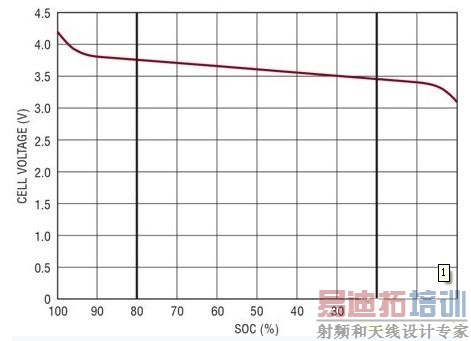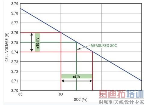 为了阐明电池测量准确度的重要性,我们来看一下简化的锂电池放电曲线(示于图1)。该曲线在整个工作区内具有一个恒定的5mV/% (SOC)斜率。倘若电池电压测量准确度欠佳,那么工作在20%至80% SOC范围之内且具有相似放电特性的电池组将面临严重的不利后果。