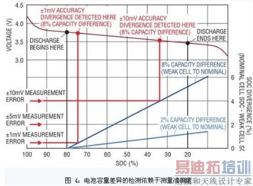 理想的情况是:主动平衡应在电池达到SOC范围的末端时启用。为阐明这一点,我们假设一个含有多节具均匀容量的电池以及一节较低容量"弱"电池的电池组。如果所有的电池都被充电至80% SOC并随后放电,则那节弱电池的SOC将慢慢地与其余的各节电池出现偏差。BMS必须确定一个合适的点,以使平衡器能够在其他电池继续放电的同时将那节弱电池保持在运行状态。图4示出了放电周期中的SOC偏差情况,列举了两个例子:一个例子是一节电池的容量与电池组其余电池相差2%,而在另一个例子中则是相差8%.BMS电池测量误差设定了一个用于确定电池之间相对状态的限值。当SOC测量误差为±2% (±10mV)时,在电池测量电路可靠地检测到这一情况之前电池彼此之间的电荷失衡最大有可能达到4%.如果不具备远远优于±10mV的电池测量准确度,那么要在这条放电曲线的某个精确定义的点上实现一个主动平衡器几乎将是不可能的。