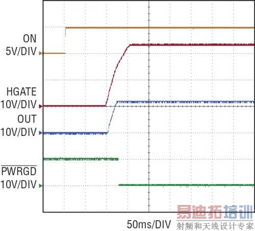 图 3:当 ON 引脚切换到高电平时,在 100ms 延迟之后,热插拔控制器 HGATE 启动,PWRGD 被拉低