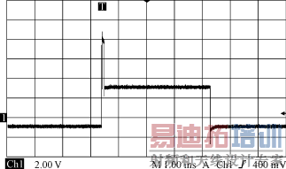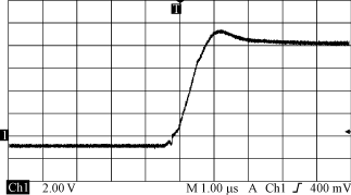 图11及图12分别为驱动电路输出Vo及其上升沿展开的实验波形,波形上升沿大约为1μs,保证了晶闸管的快速导通,强触发宽度为100μs,保证触发的可靠性。在光纤信号结束时,输出大约-0.8V,为器件的关断提供反向电流,加速关断过程,保证了关断的可靠性。
