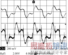实测电流值及电路工作效率等见表1所列。其中Lm为激磁电感;ΔiL为激磁电感上电流增量;Is为原边电流有效值;I21及I22分别为副边输出电流有效值;η为变压器转换效率。由表1可发现,非晶铁心虽然具有较大的激磁电感,但由于非晶铁心具有很低的电阻率,在开关频率较高的情况下,涡流损耗很大,使得总损耗较铁氧体高。由表1还可看出,虽然变压器绕组匝数很少,但由于采用了电流源供电方式,铁心仍然具有良好的能量传递特性,漏电流较小。
