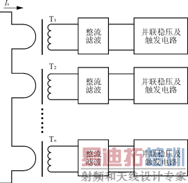 多路输出隔离电源驱动电路如图2所示,它利用一组公用的交流母线,在主电路需要辅助电源的地方进行高频变压器隔离变换并经整流,滤波,稳压后变成所需要的直流电压。分布式供电方法解决了多路隔离输出的困难,并且在实际电路中它与供电对象之间可以靠得很近,减小了被干扰的机会。隔离变压器的绝缘电压也可以做得比较高,原副边的分布电容比较小。