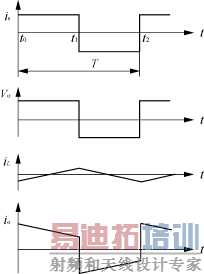 [t1-t2]阶段,Vo为低电平,iL线性下降,其增量为