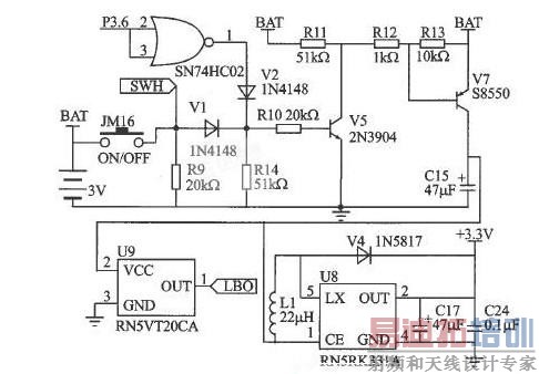 与图1相比较,用JM16键开机后,还必须利用单片机P3.6输出低电平实现开机自保,因此称该电路为"软开关电路"。使用该软开关电路的优点是无须考虑按键去抖动问题,硬件电路简单,可降低硬件成本,节约印制板板面,在手持式产品中印制板板面是非常宝贵的(元器件的数量直接影响印制板的大小和产品整体外观)。缺点是当受到外界强信号干扰或由于电池电量不足而引起死机时,按键JM16将不起作用,必须取出电池,再重新装入方能解决死机现象。当然这种情况出现的机率极低,且因电池电量不足而引起死机时,就需要更换电池了。而图1的硬开关电路中,当碰到死机现象时,无需触摸电池,通过按键JM2就能实现开机和关机。