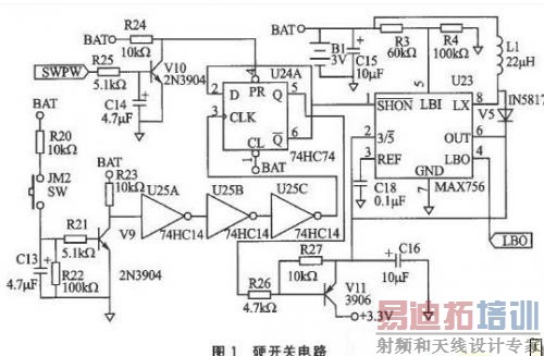硬开关电路是将2节7号电池的串联电压通过DC/DC转换器MAX756转换成3.3 V的电压,电路图如图1所示。如果不经升压电路而直接由电池供电,那么因电池端产生的电压存在一个由高到低的下降过程。2节新电池的串联电压在3 V以上,随着能量的耗尽,会下降到2V以下,导致机器无法正常工作。JM2按键为开/关机键,在按动JM2时,由于按键的抖动,会产生误动作。由R20,C13,R21,R22,R23,V9构成的充放电回路,作用是通过适当地选择R20,C13,R21的值,使充放电回路的充电时间与放电时间都大于键抖动时间,从而有效地消除键的抖动。V9集电极输出的按键脉冲经去抖后,再通过U25 (74HC14)三个带施密特触发器的反相器进一步滤波整形,产生波形完整的单脉冲。由该脉冲触发U24A(74HC74 D触发器)的翻转。