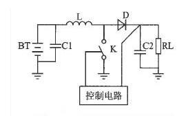 开关K导通时电池BT给电感L充电,在L中以场的形式储存能量1/(2L×I2)。其中,I为电感电流。K断开后,L中的磁能又以电能的形式释放给滤波电容C2和负载RL.周期性的开关操作使电池能量源源不断地送入负载,而输出电压被转换为: