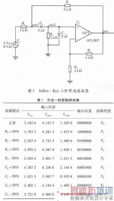 信息构造样本集电路中测试点的选取依据电路灵敏度的分析。显然测试点越多,数据量越大,需要根据电路的复杂程度和计算量、时间综合考虑,仿真实验表明,取3~4个测试点较好。