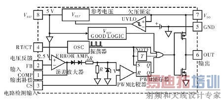 UC2843是一种电流型脉宽调制电源芯片,价格低廉,广泛应用于电子信息设备的电源电路设计,常用作反馈式开关电源的控制电路。UC2843工作电压为8.5~36V,是专为离线和DC-DC变换器应用而设计,提供了只需少量外部元件就能获得低成本高效益的解决方案。具有可微调的振荡器、能进行精确的占空比控制、温度补偿的参考电压、高增益的误差放大器。电流取样比较器和大电流图腾柱式输出,是驱动功率MOSFET的理想器件。其它的保护特性包括滞后式欠压锁定,低压锁定门限为8.5V(通)和7.6V(断),还有逐周电流限制、可控输出静区时间等。