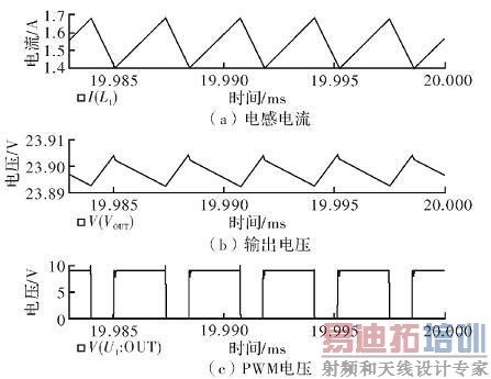 对图1所示电路,借助PSpice进行仿真,获得如图2所示的波形图。这是典型的电感电流连续导通模式(CCM)。