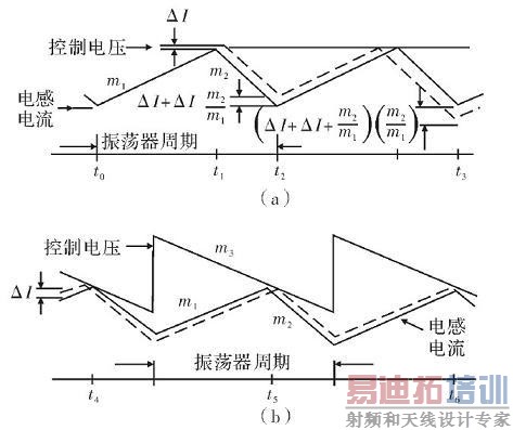 在CCM条件下,占空比超过50%时,电流模式存在固有不稳定性,也称为次谐波振荡。这种不稳定性与稳压器的闭环特性无关,它是由固定频率和峰值电流取样同时工作所引起。图4(a)显示了这种现象,在t0时刻,开关开始导通,使电感电流以斜率m1上升,t1时刻,电流取样输入达到由控制电压建立的门限。这导致开关断开,电流以斜率m2衰减,直至下一个振荡器周期。如果有一个扰动加到控制电压上,产生一个小的△I,在一个固定的振荡器周期内,电流衰减时间减少,最小电流在开关接通时刻t2,上升了△I+△I*m2/m1.最小电流在下一个周期t3减小至(△I+△I*m2/m1)m2/m1.如果m2>m1,这样扰动经过几个开关周期的逐渐积累后,就会出现占空比一大一小的现象,即发生了次谐波振荡。图4(b)显示了通过在控制电压上增加一个与脉宽调制时钟同步的人为斜坡,该斜坡的斜率如果≤m2/2,才能使得电感电流跟随控制电压,达到真正的电流模式工作。
