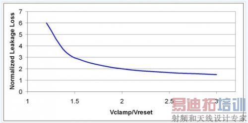 图3显示了这种关系。该图绘出了漏极电感能量损耗标准化损耗与钳位电压和重位电压之比的对比关系。在钳位电压高值位置,缓冲器损耗接近漏极电感中的能量。由于减小电阻降低了钳位电压,因此能量从主输出分流,同时缓冲器损耗急剧增加。在1.5 Vclamp/Vreset比时,其几乎三倍于漏极电感存储能量相关的损耗。