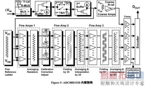 上图是一个典型的folding-interpolation架构的Giga ADC框图。在这类ADC中,为了解决模拟输入端的匹配误差和输入偏置误差,集成了一个校准信号源,在不需要外部输入的情况下,实现芯片的前台校准,使芯片达到最大性能。除此之外,还包括输入的buffer,采保电路,foldinginterpolation电路以及比较器、encoder和LVDS输出电路。