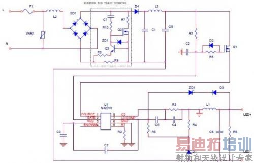 图3全电压TRAIC调光非隔离高功因之BUCK架构LED驱动电路