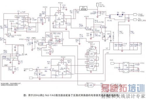 下图所示的是用于20Hz调QNd-YAG激光器且配备了反激式转换器的电容器充电装置的电路图。在这个设计方案中,可按要求在50ms之内对30μF的蓄能电容器充入15J的电能,从而确保激光器在20Hz的条件下可正常运行。
