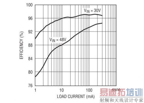 图1示出了一款48V至24V转换应用电路,其展现了LTC3630的特性,包括欠压闭锁和输出电流限制。工作效率示于图2.