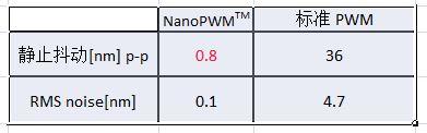 使用NanoPWM驱动器比使用线性驱动器时的静止抖动明显减小(小4.5倍:0.8nmVr3.6nm)