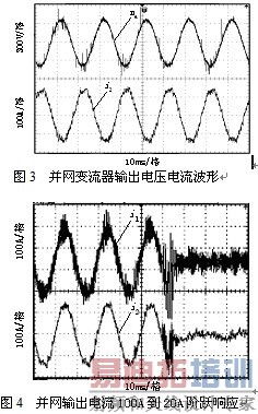 为验证上述控制策略的实用性,在实验室构建了15KW的变速恒频风力发电的模拟平台,网侧变流器的额定功率为15KW,直流母线电压400V,直流侧平波电容6600uf,额定电流35A,L1=0.5mH,R1=R2=0.001Ω,L2=0.5mH, C2=100uF,开关频率设为2kHz。图3为采用LCL型滤波器的并网变流器输出的电压电流波形。并网变流器采用LCL型滤波器,可以有效衰减输出电流中的谐波分量,满足系统设计要求的同时降低滤波器电感取值,且不影响系统以负单位功率因数稳定运行。图4与图5分别为进行正负阶跃扰动实验时的电流响应波形,曲线i1为采用电感滤波的变流器电流波形,曲线i2为采用LCL型滤波器的变流器电流波形,从中可以看出与典型并网变流器相比,采用LCL型滤波器的并网变流器动态响应很快,100A-20A和20A-100A阶跃响应只需一个正弦波周期就可以进入稳态。