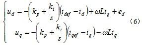 由式(5)可以看出d、q轴电流不独立,存在交叉耦合关系,变流器电路虽是静止电路,但变换至旋转坐标系中,经电感作用会使d、q轴之间产生耦合,控制系统只有通过解耦才能单独控制id、iq,式中d-q轴电流除受控制量VdcSq、VdcSd的影响外,还受到交叉耦合电压 、 扰动和电网电压的扰动。因此单纯的d、q轴电流负反馈不能实现解耦。引入电流状态反馈解耦以及电网电压作为前馈补偿,即可实现由ud、uq分别独立控制。应用传统的PI控制器,控制效果不好,为此采用前馈解耦控制策略,三相同步旋转坐标系下电流控制时的电压指令为: