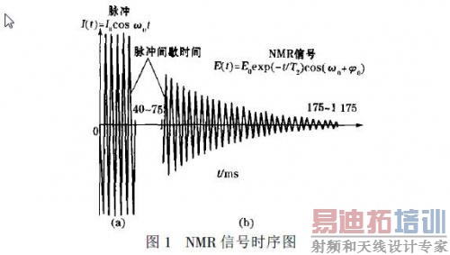 理论上流过天线的交变电流脉冲的包络线为矩形,如图1(a)所示。其中: 1≤t≤τp ;ω0= 2πf0; I0 ,Sp分别为交变电流脉冲的幅度和持续时间。发射电流的幅度与持续时间的乘积( q = I 0τp )决定了勘探深度,图1( b)为天线上接收到的NMR信号,该信号按指数规律衰减。