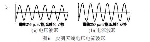 实验室实测电路如图5,电路中开关T上电压VCC取值为4V,两个电容C1 ,C2容量为6μF,天线内阻取R1= 0.2欧, L = 0。5 mH,开关上持续提供占空比为50%的矩形波信号,利用数字存储示波器TDS1012测试到天线两端电压电流波形如图6( a)、图6( b)所示,从电压波形可以看出波形为完好正弦波,幅值达到75 V,相当于将电源电压4 V扩大将近18倍,此时回路发生串联谐振。电流波形幅值可求I = 2 V/ 0.2欧 = 10 A,电流大小主要取决天线内阻,若天线内阻增大则电流值减小,从电压电流波形还可以测试出谐振频率为f0= 2500 Hz,满足当地拉莫尔频率数值。