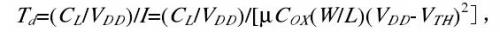 即有Td∝(CdVDD)/(VDD-VTH)2,其中W和L分别是器件的栅宽和栅长,μ为载流子迁移率,COX为氧化层电容,VTH为MOS管阈值电压。