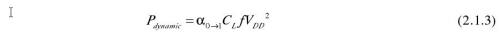 式中,α0→1是开关活动因子,表示每个时钟周期内的状态跳变次数,其大小与电路结构、逻辑功能、输入信号的状态和节点的初始状态有关,一般地,CMOS电路中有α0→1≤1;CL是等效负载电容;ƒ是时钟频率;VDD是电源电压。