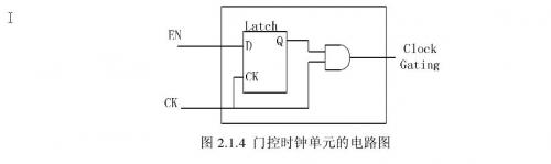 以寄存器为例,门控时钟的基本思想是,通过一个门控或使能信号来控制时钟,即在所谓的门控时钟单元的输出端产生一个"门控时钟"信号,代替寄存器原有的时钟输入信号。当寄存器暂时不工作时,门控时钟使寄存器处于不触发的状态,从而阻断了输入数据的更新,减少了无效的开关活动。在如图2.1.4所示的门控时钟单元中,常用锁存器来防止使能信号传播到输出端时产生的毛刺。