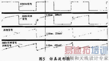 利用上华0.5μm CMOS工艺和cadence软件对这种设计方法进行了仿真验证。斜坡信号、采样电流信号、相加信号波形如图5所示。
