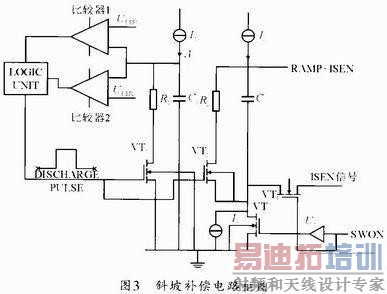 实际的电路中,由于开关管VT4会引入尖峰毛刺,进而可能会导致PWM比较器误输出。所以一般会在ISEN信号通路处加入一个简单的RC滤波器,这时就会有一个电阻R串接在电容下端和ISEN信号端之间。因此在当SWON为高电平时,由于此时VT3关闭,所以会有一个大小等于IChar ge的电流流过电阻R,从而使ISEN采样信号与电容下端电压产生偏差。解决方法是在电容C2下端加入一个电流为ICharge的电流源,引入电流源后(如图3中I3所示),SWON为高电平时流过R的电流就可以忽略不计,此时斜坡补偿的误差就可以大大减小。