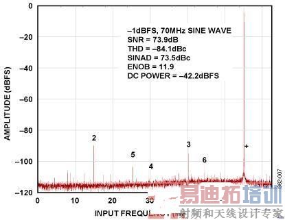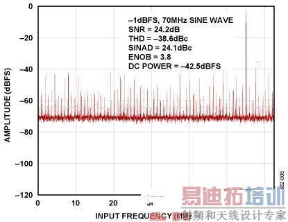 图4显示AD9265评估板直接耦合至外部带通滤波器时的性能,中心频率为70 MHz,采样率为125 MSPS.AD9265评估板的标准配置可采用一个RF巴伦将单端信号转换为差分信号。