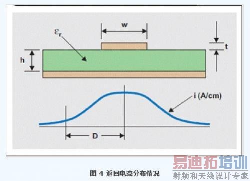 重要的是,清楚地知道某个分割层中的接地电流如何流动以及流向何处。大多数设计人员只想到了信号电流流向何处,而忽略了返回电流的路径。高频信号有一个特点:沿阻抗(电感)最低的路径流动。路径电感由路径圈起的环路面积大小决定。电流返回源必须经过的面积越大,电感也就越大。最小电感路径直接靠近线路。因此,不管是哪一层—电源或者接地—返回电流都在与线路相邻的层上流动。电流在该层内会微有扩散,并且保持在线路下面。本质上而言,其精确分布情况与高斯曲线类似。图4表明,返回电流直接位于信号线路下面。这会形成一条最小阻抗的路径。