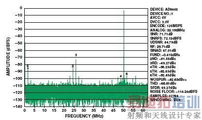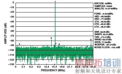 MATLAB模型中采用的系数ai用于AD9445高性能125 MSPS 16 bit ADC.图2所示的前端配置中的AD9445用来产生图3所示的快速傅立叶变换(FFT)系数。