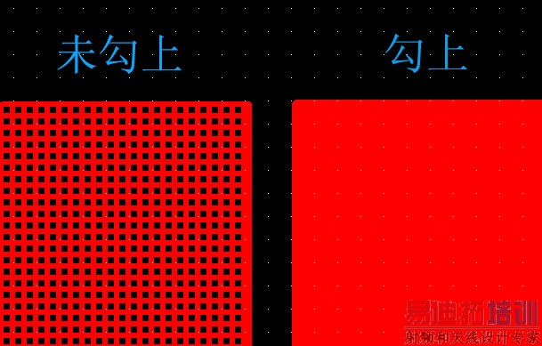 Tip: The Solid Copper check box forces copper to use trace clearance rules. 勾上的时候,铜皮会忽略网格和线宽的设置,直接填满铜皮。如图,hatch grid:50,line width:25