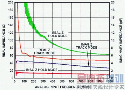 蓝色曲线和红色曲线分别表示ADC输入SHA网络在跟踪和保持模式下输入电容阻抗的虚部(对应右边的纵坐标)。在小于100 MHz时,电容阻抗的虚部从跟踪模式下的大于4pF变化到保持模式下的1pF。输入SHA网络在跟踪和保持模式下的输入阻抗实部分别用橙色和绿色曲线表示(对应左边的纵坐标)。正如预期的那样,与保持模式相比,跟踪模式下的阻抗值要低得多。带缓冲器输入的ADC阻抗在整个标称宽带内都保持恒定,而开关电容ADC的输入阻抗在最初的100MHz输入带宽内会产生很大变化。