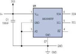 ALS (图4)不安装在控制器的PCB,而是按照在灯管位置。传感器采用4线连接器J1连接至PCB。该ALS为MAX44009,选用该器件的原因是其超小尺寸(2mm x 2mm)、6引脚UTDFN封装,很容易安装在灯座上(图5)。