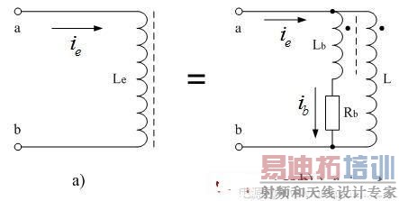 图2-29-a中,Le是一个同时考虑涡流损耗因素的电感;L是变压器原初级线圈的电感;Rb是铁芯涡流损耗电阻;Lb是一个互感线圈,通过它把流过电阻Rb的电流感应到变压器初级线圈中;当流过电阻Rb的电流增加时,流过通过Lb互感线圈的感应作用,使流过变压器初级线圈L的电流也同时增加。