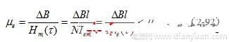 (2-92)式中, μe为变压器铁芯的有效导磁率; B为磁感应强度增量; Hm(τ)为变压器铁芯表面的最大磁场强度;N为电感线圈匝数; l变压器铁芯的平均磁回路长度; Iem为涡流损耗折算到变压器线圈中的电流与最大励磁电流之和,Iem=i(τ) ,即:涡流损耗折算到变压器线圈中的电流励磁电流之和ie 在t = τ时刻的电流值; μa为变压器铁芯的平均导磁率。