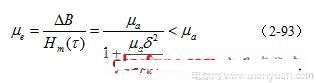 (2-93)式中,μe 为变压器铁芯的有效导磁率, B为磁感应强度增量, Hm(τ)为变压器铁芯表面的最大磁场强度, μa为变压器铁芯的平均导磁率, δ为铁芯片的厚度,ρc为铁芯片的电阻率,τ为脉冲宽度。