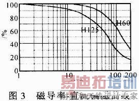填充系数通常选择在0.25~0.45范围内,典型值为0.4。系数越小,体积和成本增加,系数越大,绕制难度增加,且可能造成磁场强度增加,使磁导率快速下降,因此需要反复核算。这里取典型值:Ku=0.4,Kj=403 A/cm4,代入式(2)得:AP=129 cm4。初选磁性材料型号为H125-640,参数为ur=125,AwAe=42.58 cm4,考虑裕量,选4块磁芯可满足要求。4块磁芯并联,匝数,直流磁场强度:H=NI/Le=53.76 Oe,查材料磁导率和直流偏磁曲线,如图3所示。由图3曲线可知:此时材料的相对磁导率约降为原来的60%,所以在此状态下线圈总电感量。