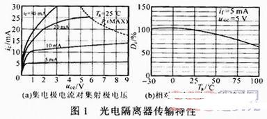 线性光耦是低压开关电源常用的隔离反馈器件,以其价格低廉和电路简单得到普遍应用。然而其稳定性和精度不适合要求较高的场合。光电隔离器传输特性如图1所示,可见,电流传输比Di在if为5 mA,10 mA时分别约为1,0.67(uce=5 V),同时uce的变化对其他参数也有较大影响;当温度从0~50℃变化时,Di从1.05变为0.9。实验结果证明,由于其参数的离散性、时间和温度的变化引起的不平衡度会增加到5.6%,因此光耦不适合高压隔离取样。