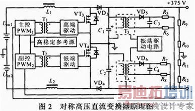 对称高压直流变换器电路原理如图2所示。