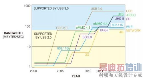 大多数移动设备中的存储器采用的是SD(安全数字)卡或eMMC(嵌入多媒体卡)闪存技术。SD 2.0标准支持最大25MB/s速度,而eMMC 4.3标准支持最大52MB/s。两者均不能有效地利用USB3.0的全部数据带宽。不过,新的SD 3.0标准改变了这种局面,新标准将SD性能提高到104MB/s。同样,最新的eMMC 4.41规范将升级到104MB/s。SD 3.0已面世,micro-SD版随后就到,而符合eMMC 4.41的闪存器件则已量产。
