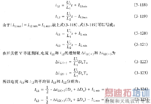 式中,Uc1=Ui+Uo;△Du·Ts为二极管续流时间; 。于是得要得到电流的关系,可以假定电感L1的电流有正负变化,即在开关管V导通时,电流iL1和iL2的瞬时值为