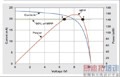 引言许多太阳能电池板供电型应用只需功率脉冲便可运行。我们需要频繁地开启数据收集或者测量采样系统,执行测量或者其他任务,发送经过处理或者测量的数据,然后再回到睡眠模式。在许多情况下,以无线方式发送这些数据消耗掉了大部分输出功率。如太阳能电池板等小功率电源,通常难以支持系统本身或者数据发送所需的这些功率脉冲。通过让太阳能电池板工作在最大功率点 (MPP),并且智能地从电池板获取功率,以实现对电能的管理,从而顺利地驱动脉冲负载。本文将为您介绍一种简单且高成本效益的最大功率点追踪 (MPPT) 解决方案,以供这类脉冲负载系统使用。 太阳能电池板特性在最大功率点工作时,太阳能电池板可提供峰值输出功率。最大功率点是一个与电池板最高可达输出功率相对应的电压和电流。在光照水平不断变化的情况下,最大功率点追踪方法对来自太阳能电池板的功率进行管理。太阳能电池板的一个特性是,电池板电压随电池板输出电流增加而下降。如果输出电流过高,则电池板电压崩溃,并且输出功率变得非常低。图 1 描述了特定太阳能电池板输出电流及输出功率与其输出电压之间的比较情况。最大功率点已被标示出来。图中,一条水平绿线条表明输出功率至少为 90% 最大功率点时的位置。该线条以上,在"点 1"和"点 2"之间时,电池板输出功率最大。 图 1 太阳能电池板最大功率点图